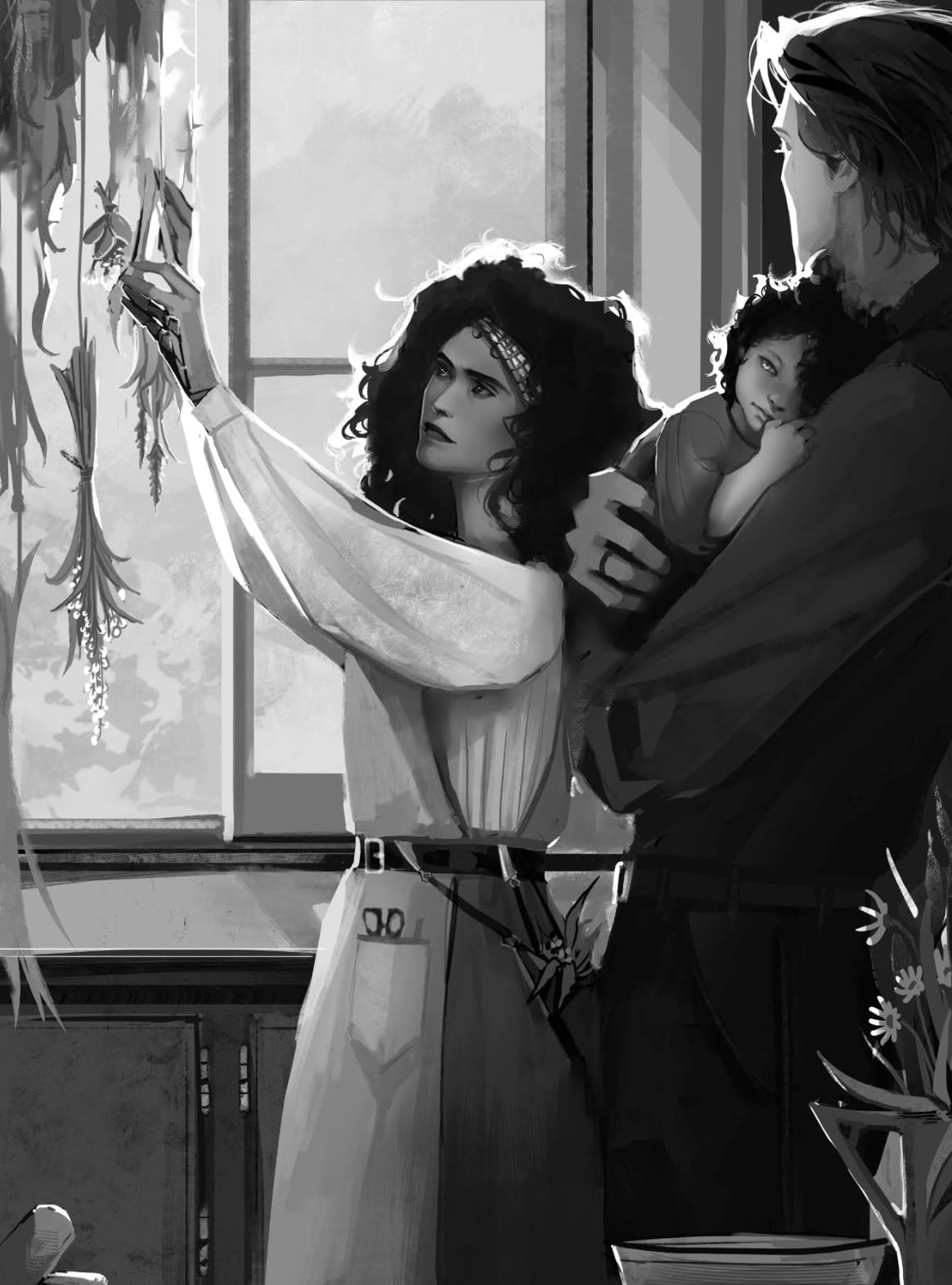 Illustration of alchemised Helena and Kaine on the island with Enid Rose